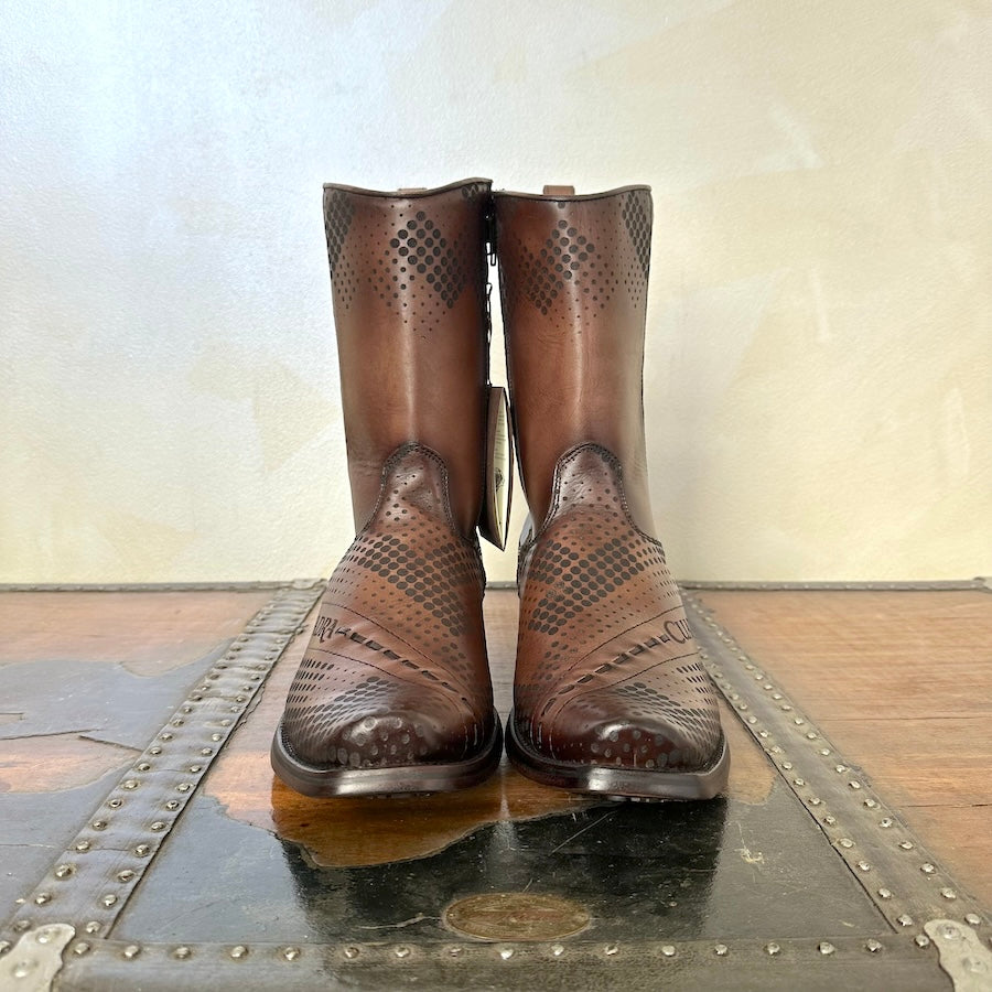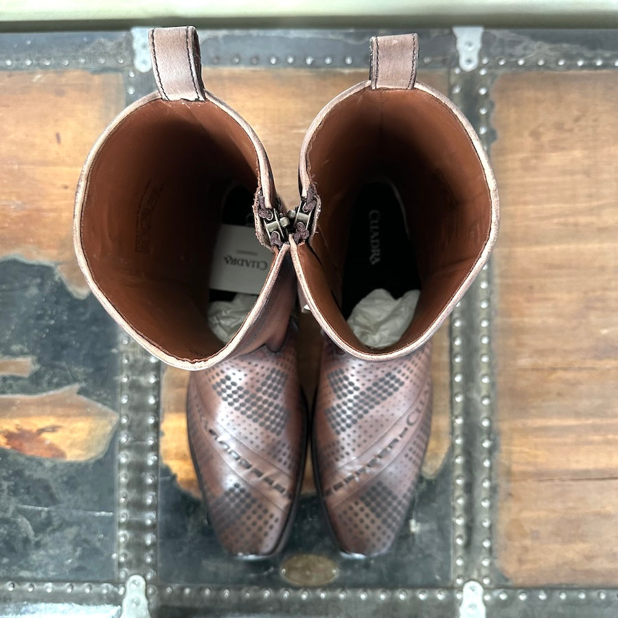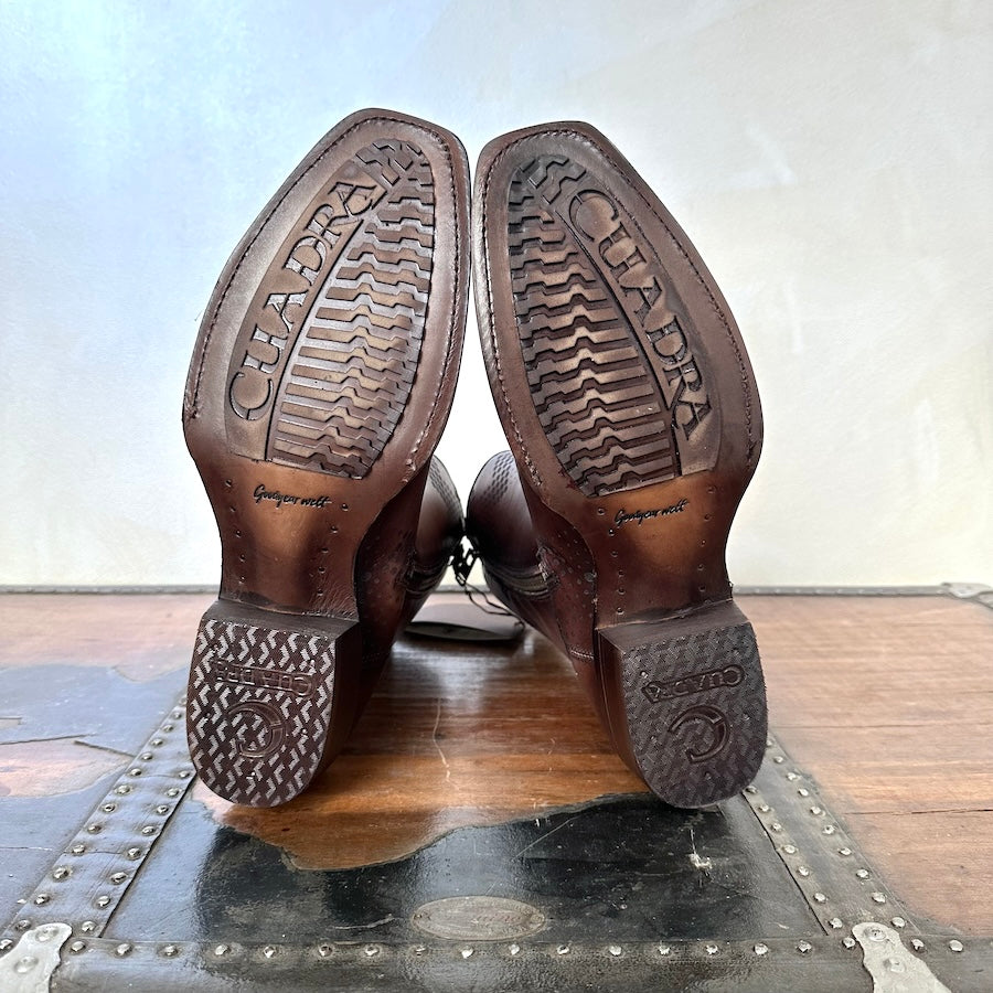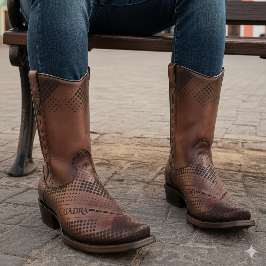 Cuadra's brown casual cowboy boots for men are crafted from genuine cowhide leather. These pull-on ankle boots feature a square toe and a rich brown patina finish. They are hand-made with Goodyear welt construction, offering durability. The boots also include a leather lining and a nonslip sole. Made in Leon, Mexico.
