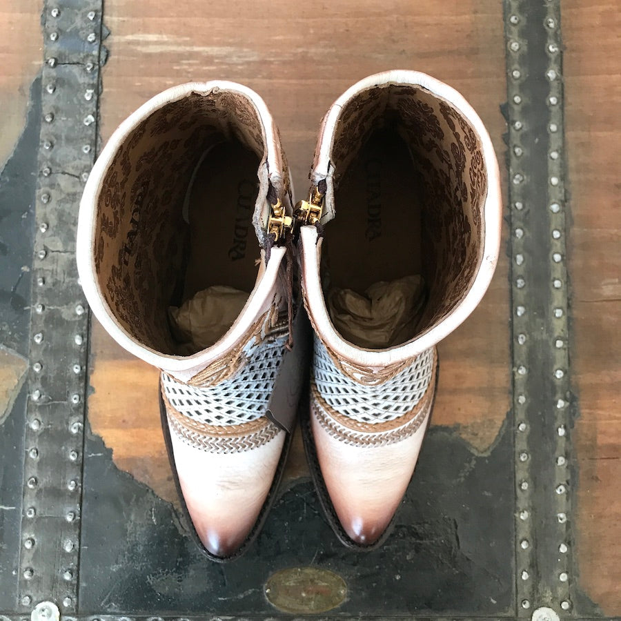 Cuadra ivory embroidered western cowgirl cowhide leather ankle boots for women. Paris Texas fashion cowboy booties.