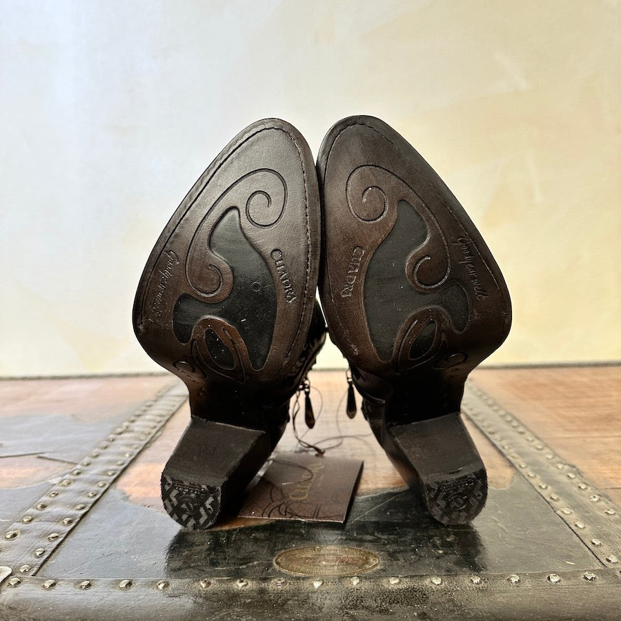 Booties for women made from bovine leather. Hand-painted design featuring perforated details and raised stitches in the front. Laces and metallic accents at the back, along with an inner zipper for improved fit. Ankle shaft with a rounded toe. Leather sole with TPU injection for enhanced traction while walking.