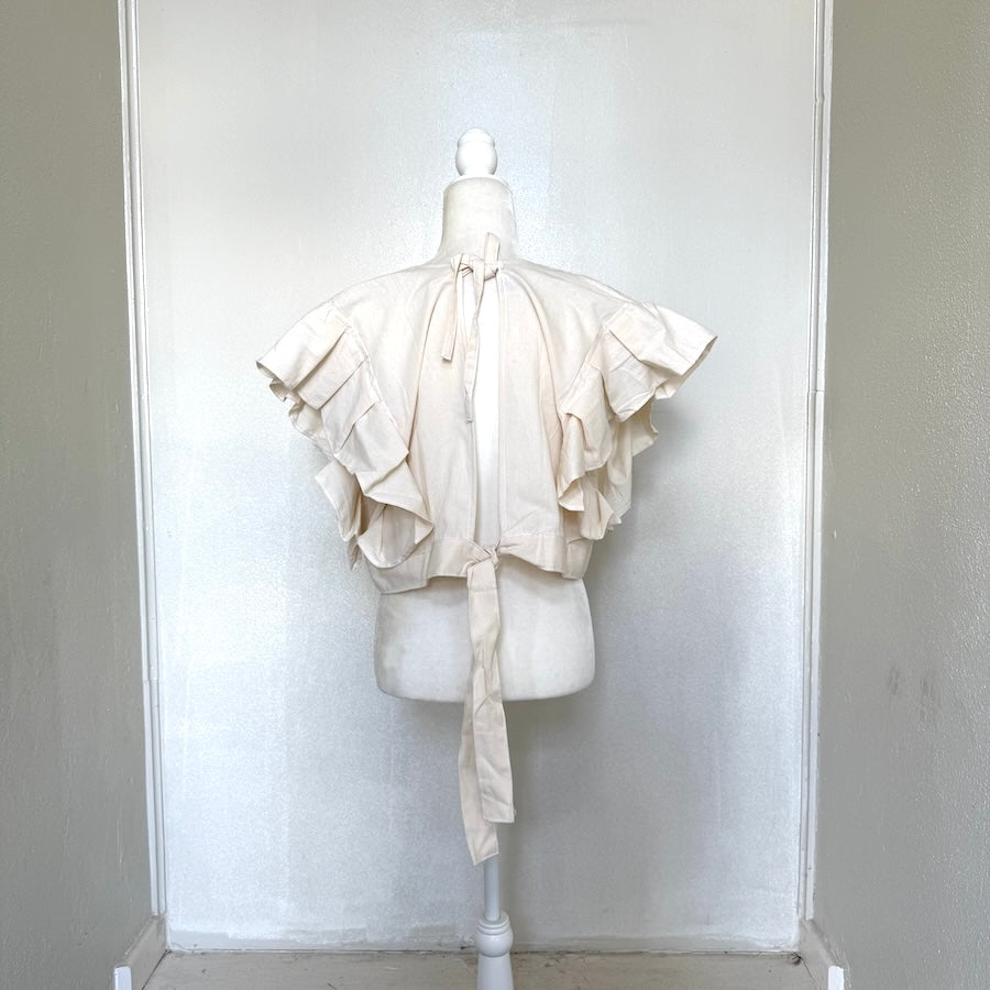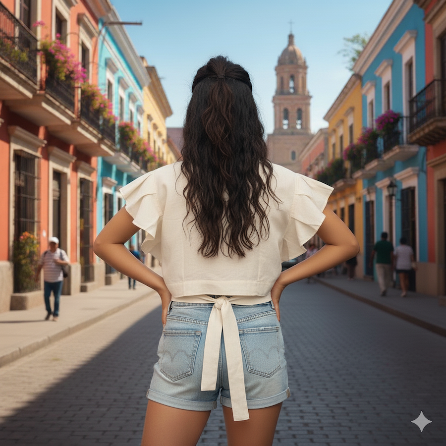 This handwoven crop top showcases Mexican artistry with floral and bird embroidery on white cotton, including delicate ruffled sleeves for elegance. Perfect for casual or festive wear, it blends culture with modern style, celebrating craftsmanship and heritage.