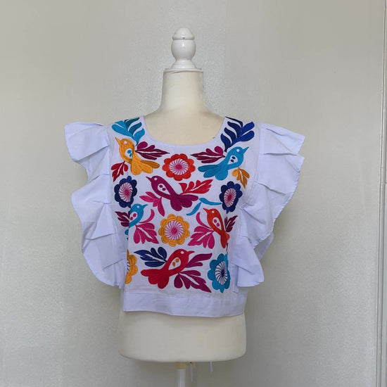This handwoven crop top showcases Mexican artistry with floral and bird embroidery on white cotton, including delicate ruffled sleeves for elegance. Perfect for casual or festive wear, it blends culture with modern style, celebrating craftsmanship and heritage.